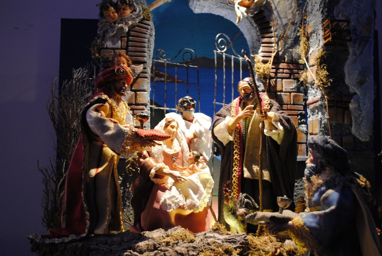 Tra le novità di quest’anno, uno spazio dedicato all’antica tradizione napoletana con un grande presepe scenografico. L’ambientazione è quella caratteristica del 700’, dove gli elementi principali sono: il tempio pagano diroccato sotto cui è sistemata la Sacra Famiglia, l’annuncio degli angeli ai pastori, dove c’è il richiamo evidente al testo evangelico, e la taverna dove i commensali gustano le vivande sapientemente esposte. Le figure utilizzate, realizzate dall’artista partenopeo Aniello Gaudino, sono pastori da 30 cm. realizzati con testa braccia e gambe in terracotta, montati su un manichino e rivestiti con tessuti, che riproducono l’abbigliamento di quel periodo |