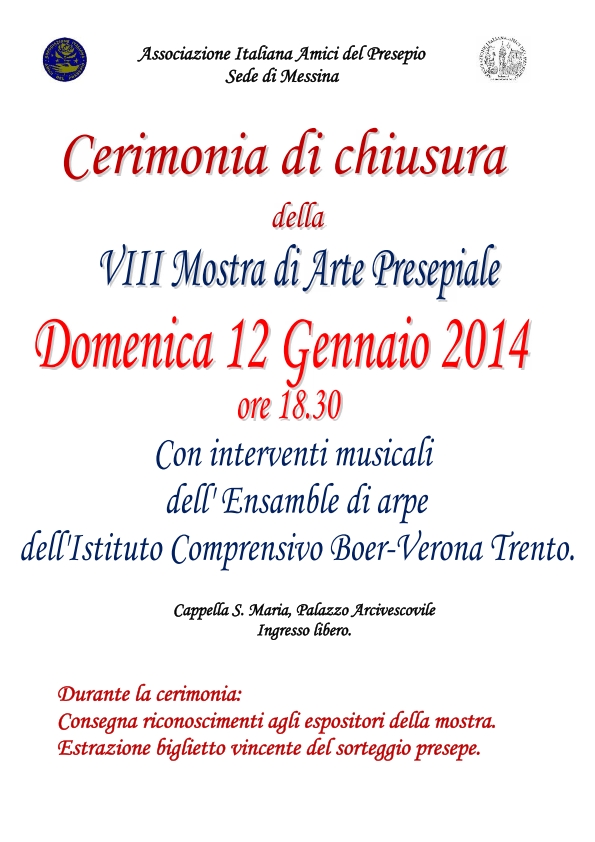 Saranno il concerto dell'Ensemble di arpe e coro, diretto dalla professoressa Valentina Celesti dell’Istituto Boer – Verona Trento e l'estrazione del biglietto vincente del presepe in sorteggio, a concludere, domenica 12 gennaio alle 18.30, l'edizione 2013-14 della Mostra di Arte Presepiale, organizzata dall'Associazione Italiana Amici del Presepio Sede di Messina, nei Chiostri dell'Arcivescovado (via I settembre, 117).